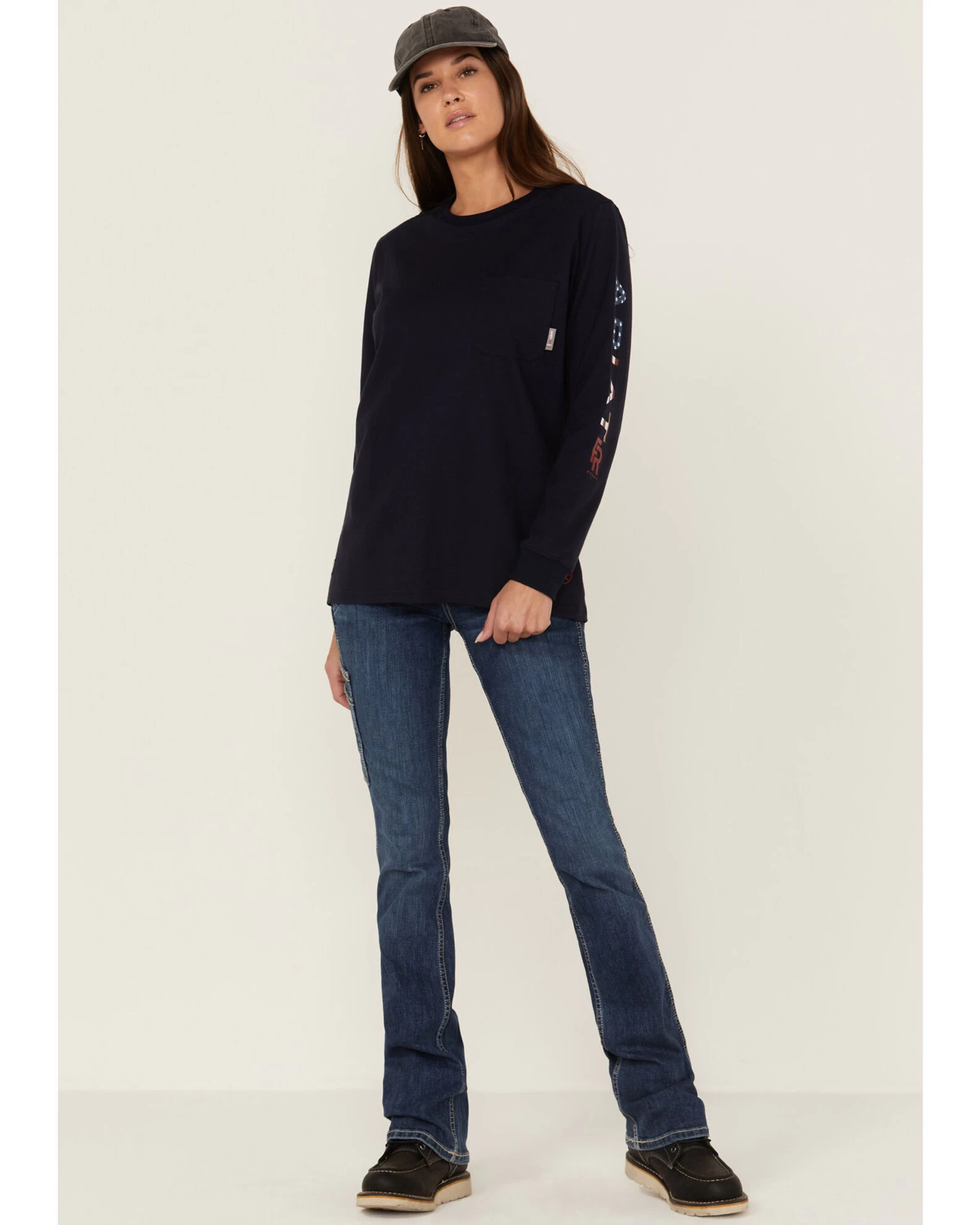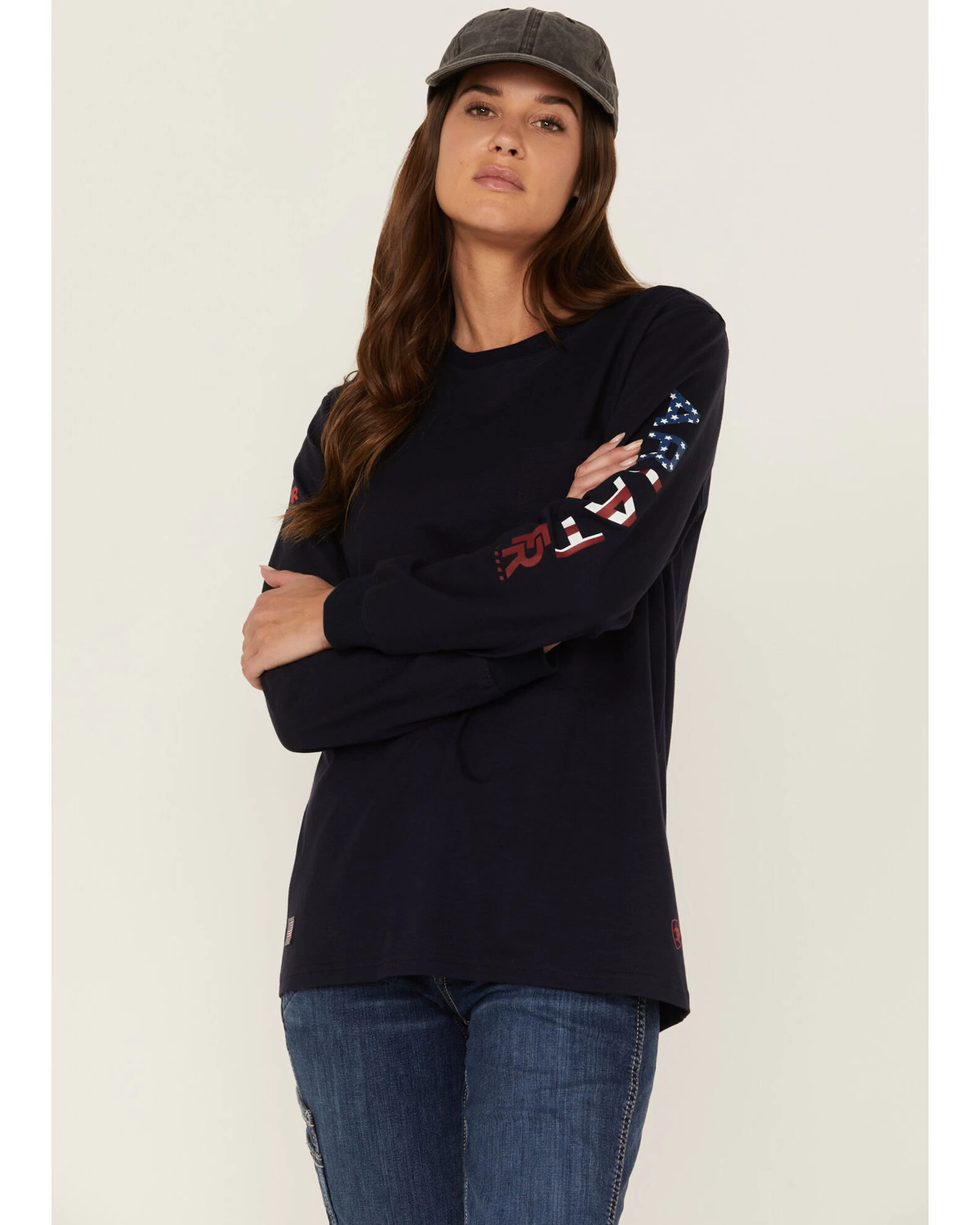 - “Ariat” patriotic logo embroidery on left sleeve