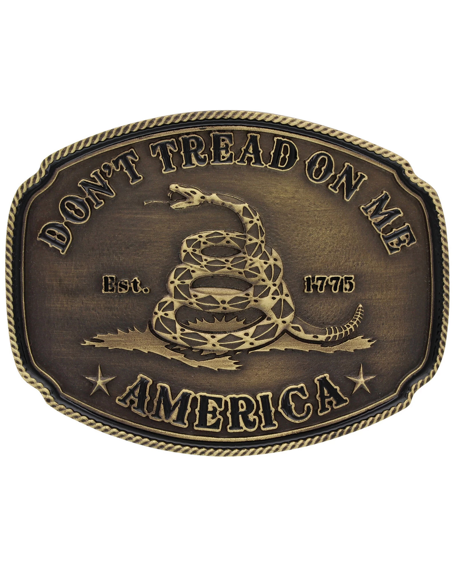 Take a piece of American Revolutionary Pride with you wherever you go in this Don’t Tread on Me Attitude Buckle by Montana Silversmiths. This medium sized ovalesque shaped buckle features a little slice of American heritage, with the Gadsden flag and the ‘Don’t Tread on Me’ with a rattler snake. Antiqued bronze finish with dark antiquing highlights the lifelike characteristics in this sculpted design.