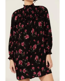 Angie Women’s Navy Long Sleeve Smocked Floral Border Mini Dress