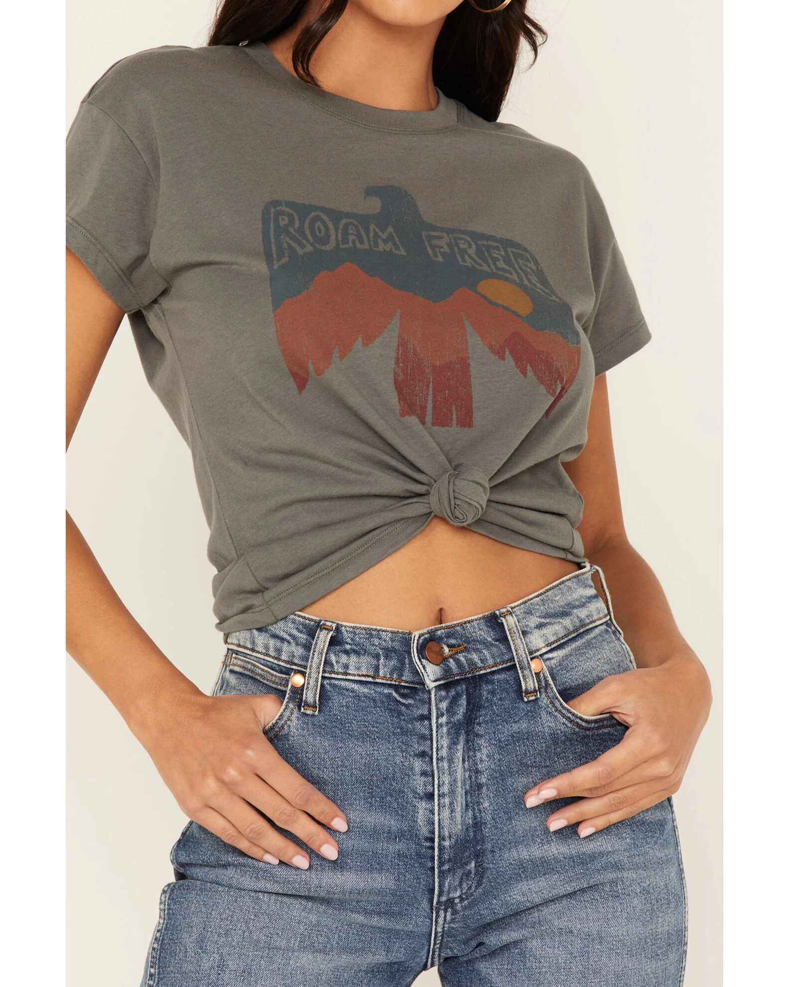 - Grayv with “Roam Free” thunderbird vintage graphic on front