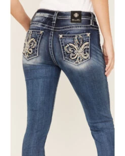 Miss Me Women’s Dark Wash Mid Rise Embroidered Fleur De Lis Jeans