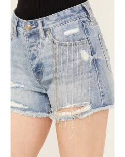 Rock & Roll Denim Women’s Light Wash Mid Rise Chain Fringe Denim Shorts