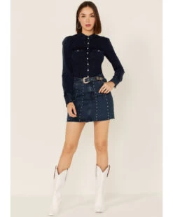 Rock & Roll Denim Women’s Dark Wash Studded Belted Western Denim Mini Skirt
