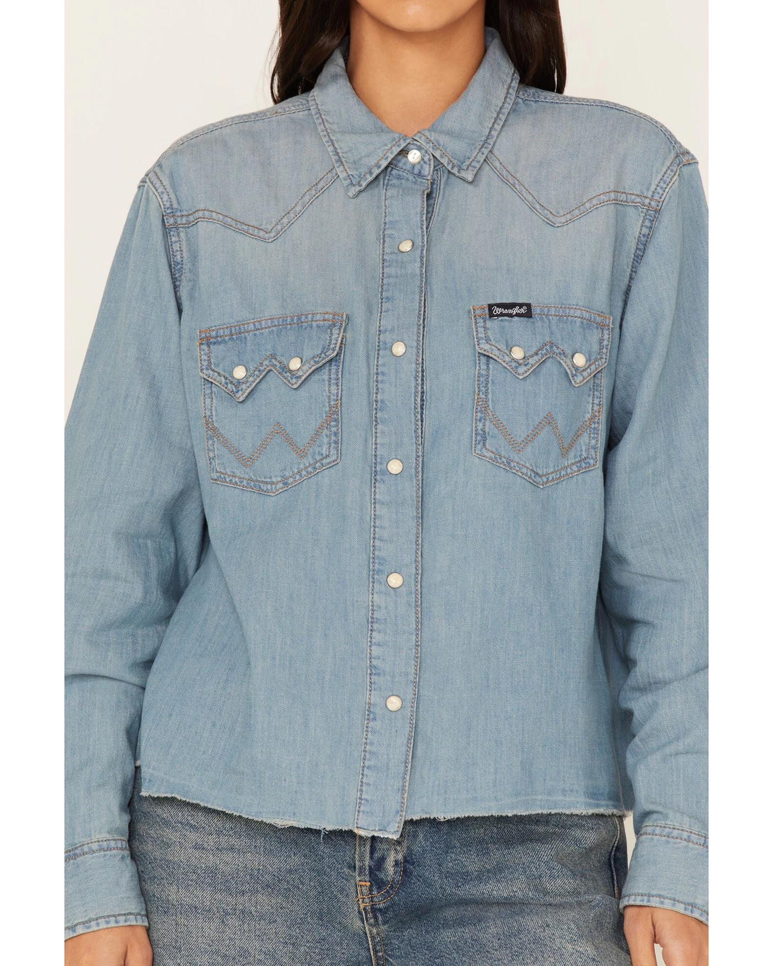 - Pearl snap closures on front placket, pockets and cuffs